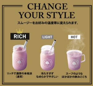 これまで当店で1番人気のクラシックスムージーでは、「RICH/LIGHT」スタイルのみの提供でしたが、「HOT」スタイルでも提供することが可能になりました。価格はもちろん、使用材料も変わらず、温度帯と質感だけを選ぶことができます。これまで冷たい飲み物としての印象が強かったスムージーですが、「フィコ&ポムム」では、店頭の一部の商品を除く、ほぼ全てのスムージーを「RICH/LIGHT/HOT」の3つの温度帯からそれぞれの嗜好やその日の気候・気分で選ぶことができ、年間を通してより身近なライフスタイルとして果物や野菜のブレンドをお楽しみいただけます。ホットスムージー™は体の冷えを気にされる方のために開発され、2013年の創業からフィコ&ポムムが業界に先駆けて今日まで提案を続けている代名詞的商品です。今回リニューアルによって1つのスムージー商品が3つの温度帯で提供される事例は、国内ではもちろん世界を見てもほぼ前例がありません。