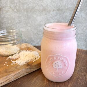 イチゴとバナナの間違いなし定番コンビネーションで、クセのないさっぱりした甘みにソイヨーグルトのほんのり酸味が特徴のストバナにドライココナッツ(+88円)を追加。