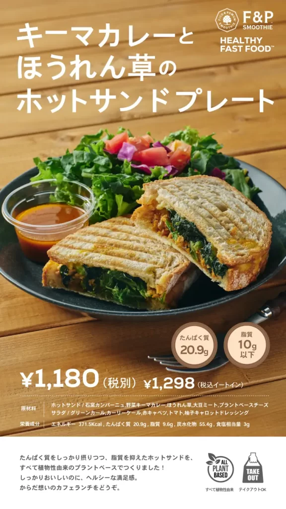 F&Pジャパン株式会社が運営する「F&P Smoothie Cafe」(以下F&Pスムージーカフェ)では、新しいフードメニュー「キーマカレーとほうれん草のホットサンド プレート」が 9月16日(火) ~ 11月14日(金)まで 登場します。