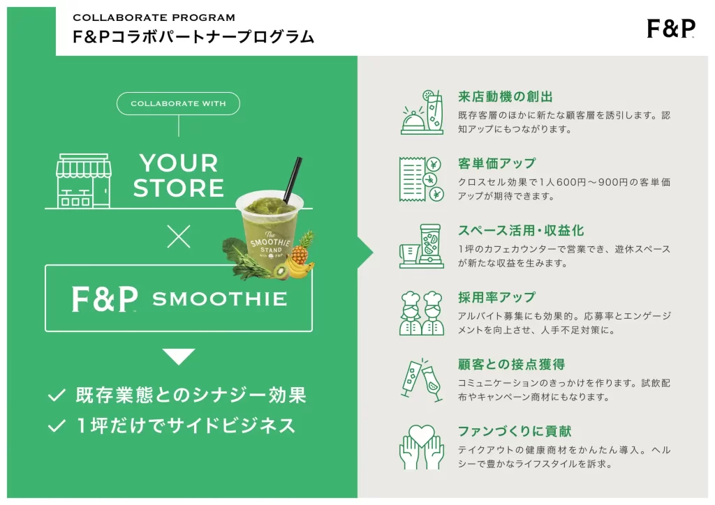 F&Pは、日本で初めてホットスムージーを開発し店舗で提供したパイオニアブランドであり、国内最多のスムージー加盟店網を展開しています。